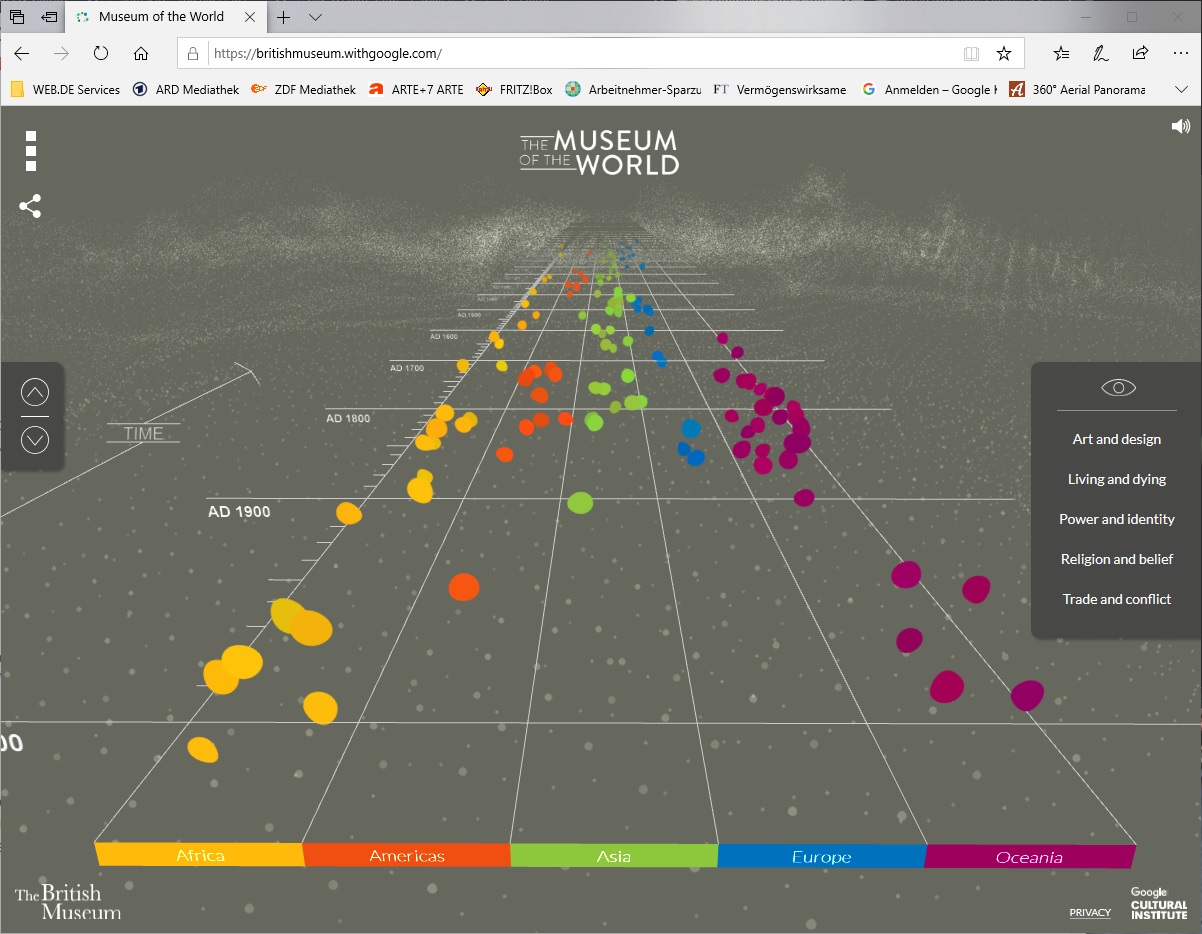 Das wohl aufwendigste Projekt von Google Arts & Culture ist gemeinsam mit dem British Museum in London entstanden. Man kann sich einfach per Maus durch die Epochen scrollen und je nach Kontinent oder Themenschwerpunkt (z.B. Kunstgeschichte oder Religion) wichtige Exponate entdecken, zu denen es dann jeweils Bild, Text sowie Audiomaterial gibt.