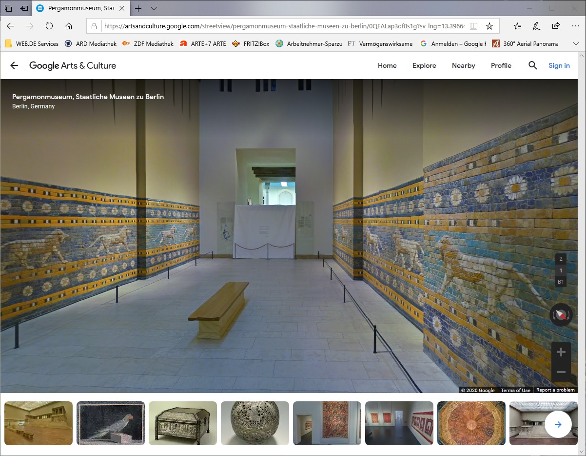 Das zum Weltkulturerbe der UNESCO zählende Bauensemble beherbergt die Antikensammlung, das Vorderasiatische Museum und das Museum für Islamische Kunst. Per Mausklick geht es bei einer virtuellen Tour vorbei an antiker Monumentalarchitektur, die in Realität zwar imposanter wirken mag, dafür genießen sie sie am Bildschirm ganz ohne andere Besucher.