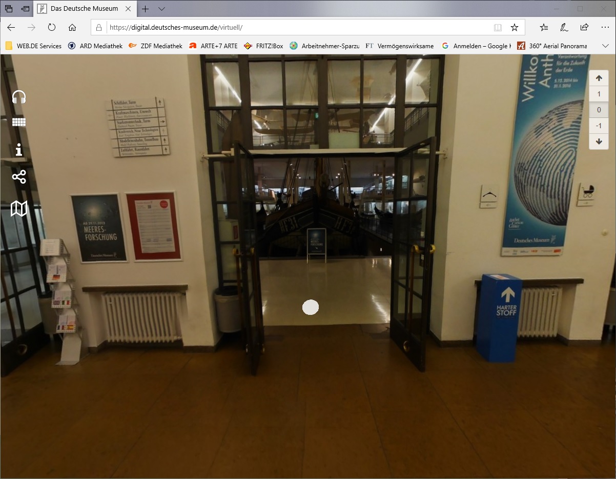 Anlässlich einer umbaubedingten Schließung im Jahr 2015 erstellte das Deutsche Museum in München einen virtuellen Rundgang mit Audio-Guides zu den Ausstellungsbereichen Schifff-, Raum- und Luftfahrt. Virtuell besuchen lassen sich allerdings alle Bereiche – zur Navigation dienen eine Karte, eine Stockwerksanzeige sowie diverse interaktive Stationen.